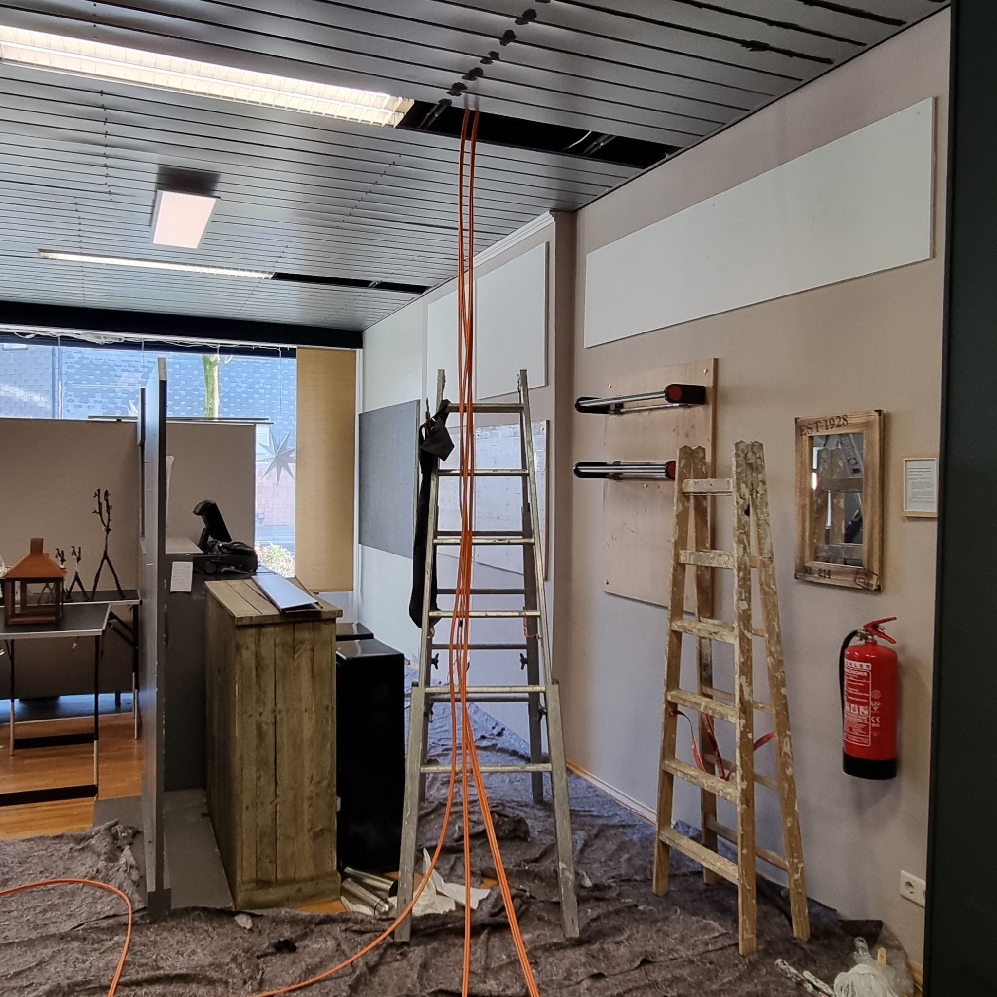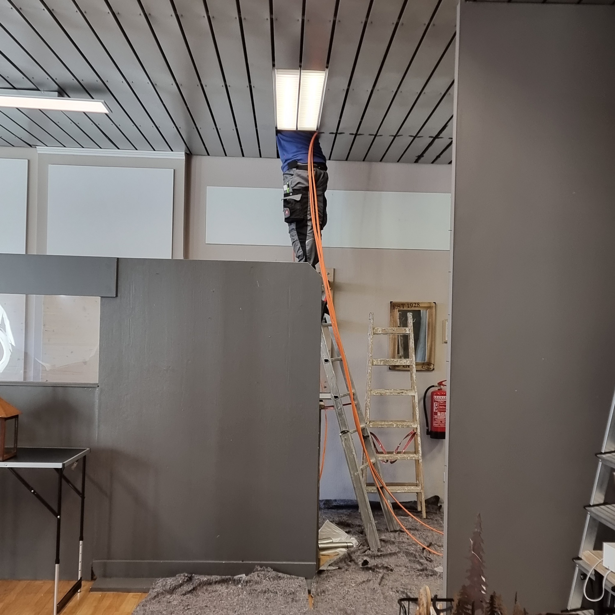 Die Elektro-Arbeiten sind im vollen Gange – und manchmal verschwinden dabei auch ganze Männer in der Decke und schaffen Raum für sehr „dekorative“ Kabelverläufe ![]()